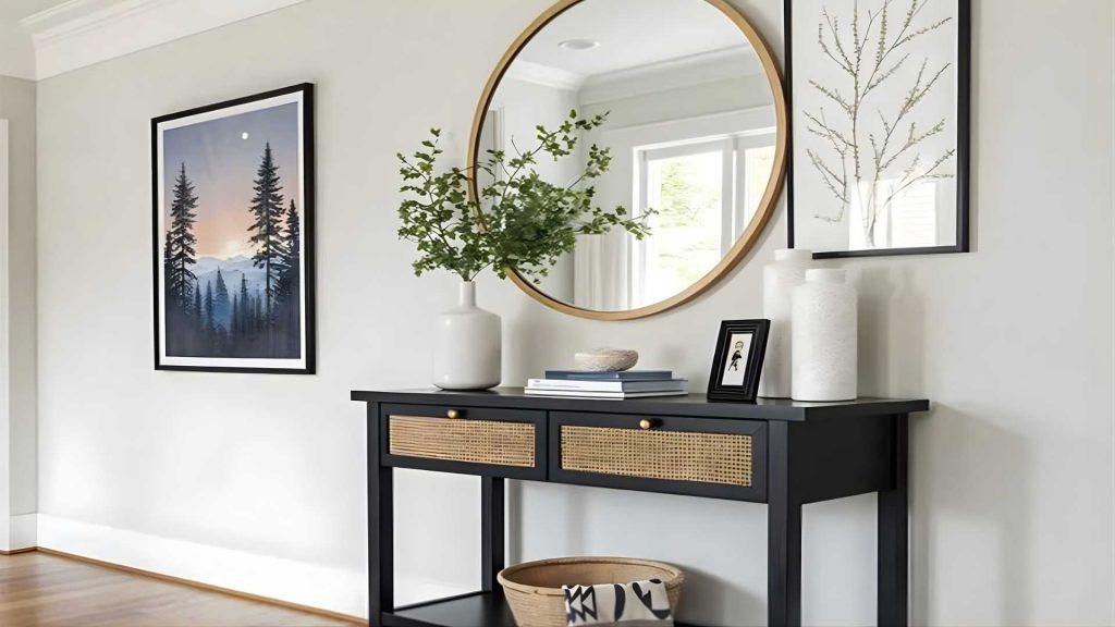 Embrace the vertical. A large statement mirror is a powerhouse tool in entrance decor. It not only allows you to check your appearance before leaving but also reflects light, making a dark, narrow foyer feel twice as large.